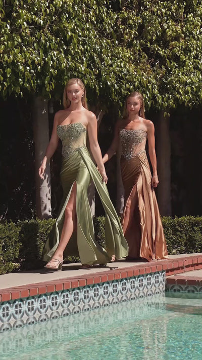 Make an unforgettable entrance in this sultry, sculpted gown designed for glamour and confidence. Featuring a strapless corset bodice with illusion mesh paneling and intricate bead embellishments, this look cinches the waist and flatters the silhouette. The satin skirt is draped to perfection with a side sash detail and high leg slit, creating fluid movement from every angle—perfect for prom, pageants, and red carpet moments.