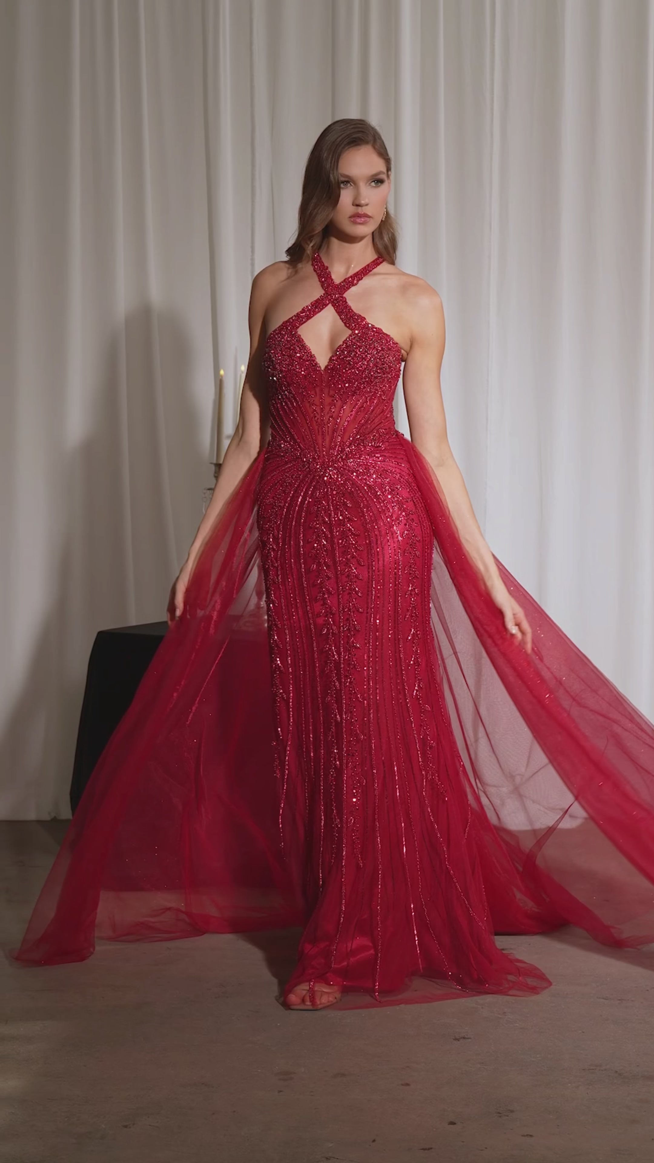 Designed to captivate, this fitted gown features a striking halter neckline with an embellished crossover design that adds drama and sophistication. The fully beaded motif sparkles across soft tulle, sculpting the body with dimensional detailing that catches the light from every angle. A sheer corset bodice enhances support while ensuring a snatched silhouette—paired with a lace-up back for adjustable comfort. The look is completed with a detachable overskirt, allowing you to transform from a grand entrance to sleek and sultry in seconds. Finished with a sweeping train, this gown is destined for the spotlight—perfect for prom, pageants, galas, or any red-carpet moment.