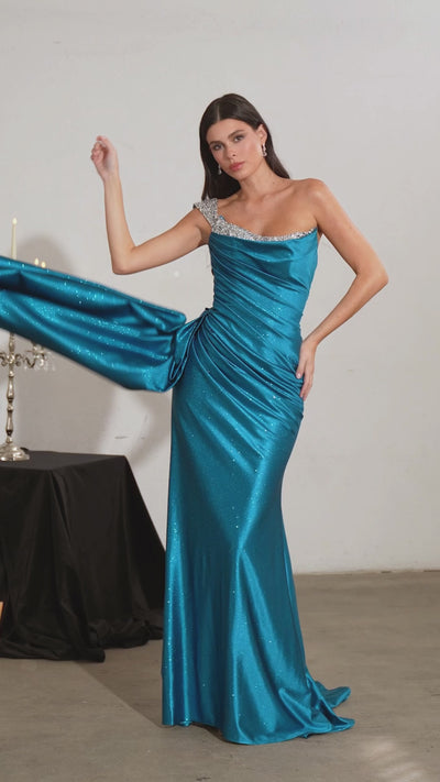Designed to turn heads, this fitted one-shoulder gown blends luxe shimmer with sculpted elegance. The asymmetrical neckline is adorned with exquisite crystal embellishment, adding a sophisticated sparkle that highlights every movement. Soft ruching wraps around the bodice and hip, creating a flattering hourglass effect while the sweeping skirt drapes into a graceful floor-length finish. Complete with a lace-up corset back for customizable support, this gown is the perfect blend of glamour and modern refinement—ideal for evening galas, prom, or any unforgettable celebration.