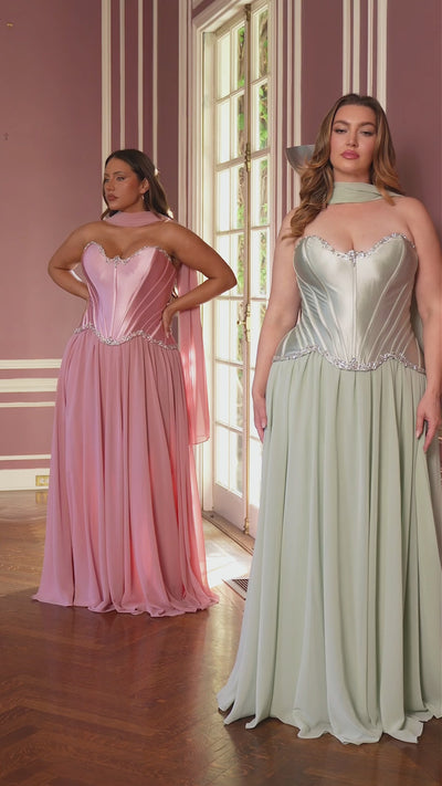 This breathtaking ball gown is crafted to flatter every curve with elegance and ease. The sculpted satin corset bodice offers secure support while showcasing your shape, adorned with delicate crystal detailing that adds a luxurious, light-catching glow. Its strapless sweetheart neckline highlights the décolletage beautifully, flowing into a soft chiffon skirt that moves effortlessly with you. Finished with a lace-up back for adjustability and comfort, this gown is a stunning choice for prom, galas, and any occasion where you want to feel unforgettable.