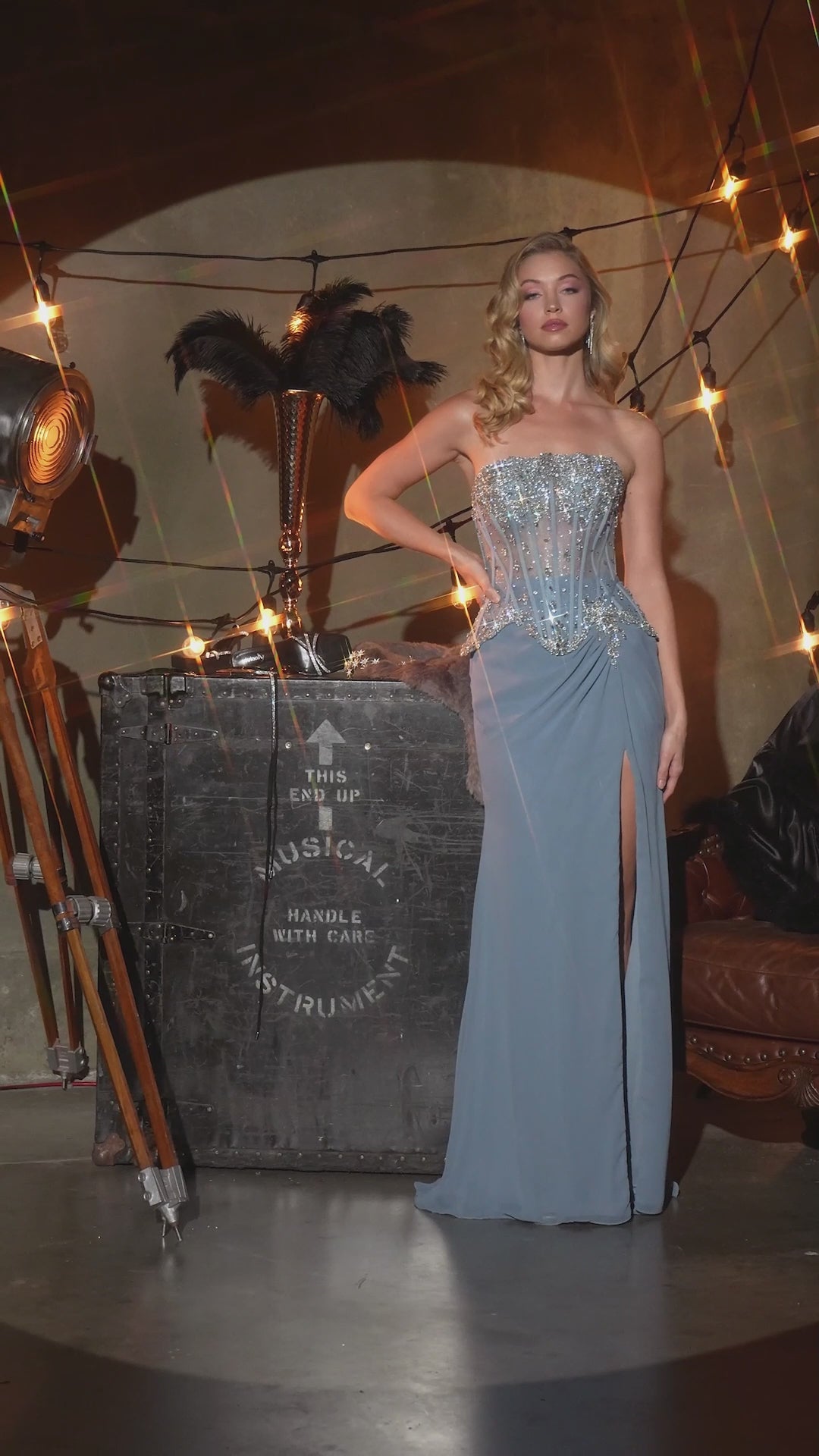 This captivating fitted gown embodies elegance and allure with its strapless corset bodice and sparkling embellishments. Adorned with intricate beadwork that trails along the neckline and waist, the sheer boned bodice accentuates the figure while offering structured support. The draped skirt flows effortlessly into a soft train, complete with a thigh-high slit for a touch of modern glamour. Finished with a lace-up back for an adjustable fit, this gown is a stunning choice for prom, galas, or evening occasions.