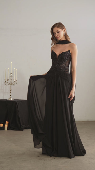 Designed to captivate, this gown features a sweetheart illusion neckline paired with a shimmering, intricately beaded bodice that catches the light from every angle. Soft draping along the waist flows into a graceful A-line skirt, creating a flattering and elongating silhouette. Finished with an elegant chiffon scarf detail that trails behind with movement, this gown blends drama and refinement—perfect for formal evenings, weddings, and any unforgettable celebration.