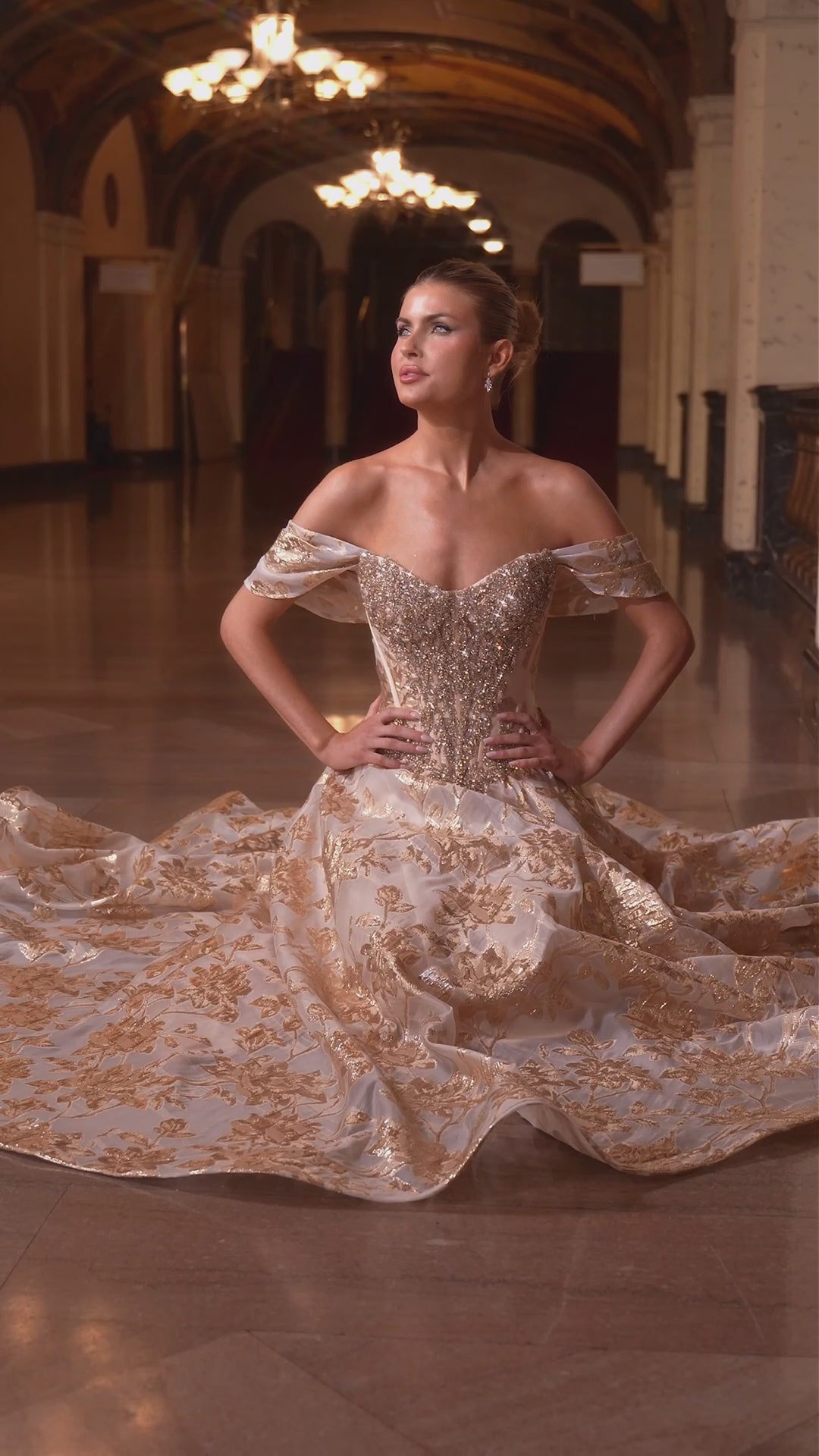 Design: Off-the-shoulder neckline with crystal-embellished bodice and metallic floral skirt