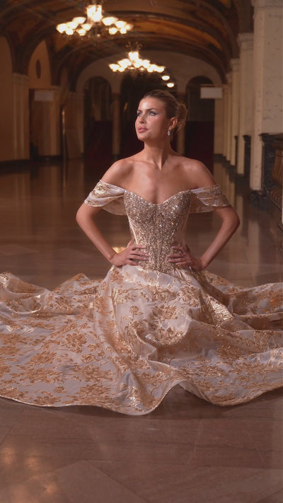 This regal ball gown exudes luxury with its off-the-shoulder neckline and lavish beaded bodice that sparkles with dimension. The structured corset top is adorned with intricate crystal embellishments, flowing into a full skirt of metallic floral jacquard that glimmers with every movement. A lace-up back ensures a flawless fit, combining opulence and romance in perfect harmony. Ideal for galas, pageants, or grand celebrations.