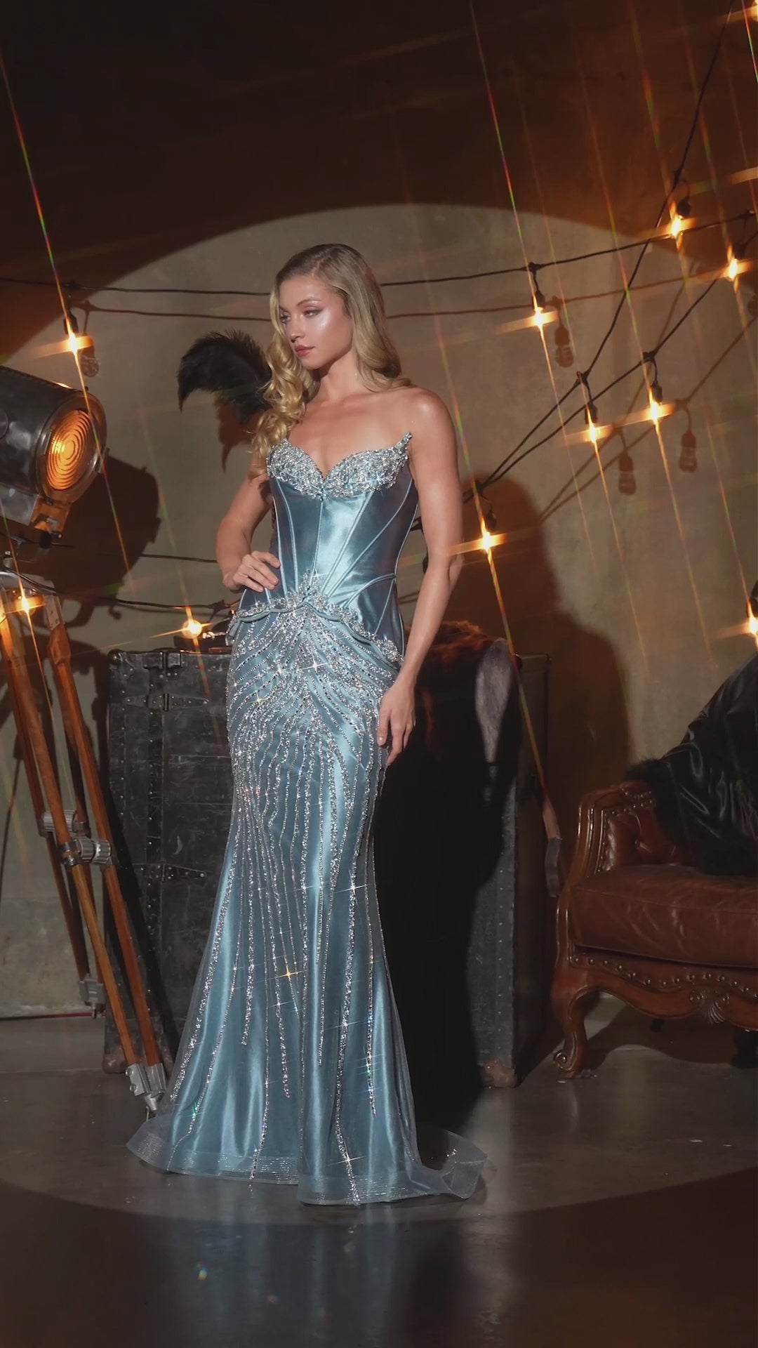 Radiate elegance in this mermaid evening gown, designed with a strapless sweetheart neckline and a sculpted corset bodice embellished with intricate crystal beadwork. The satin base shimmers beneath cascading linear bead patterns, creating a dramatic, figure-enhancing effect. Complete with a lace-up corset back and flowing sweep train, this gown is a showstopping choice for pageants, galas, and black-tie occasions.