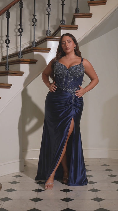 Designed to mesmerize, this fitted gown showcases a sheer corset bodice adorned with intricate beading and floral appliqué that sparkles with every movement. The ruched satin skirt accentuates the waist and flows effortlessly into a soft sweep train, while the high slit adds a striking, modern touch. Perfect for prom, pageants, or evening galas.