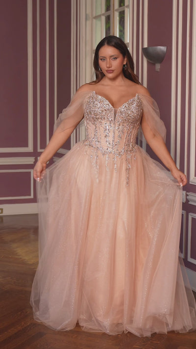 Radiate elegance in this A-line evening gown, designed with a off the shoulder sweetheart neckline and a corset bodice shimmering in dazzling crystal beadwork. The structured top gives way to a flowing layered glitter tulle skirt, creating volume and movement with every step. Complete with a supportive fit and radiant sparkle, this gown is a captivating choice for prom, black tie, and formal occasions.