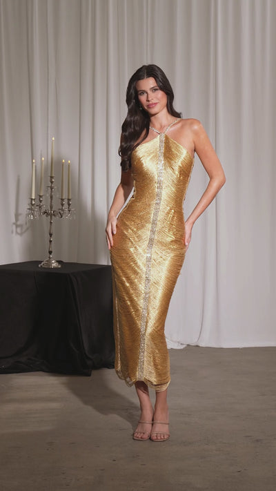 Radiant and unforgettable, this fitted metallic gown brings red-carpet glamour to life. The halter neckline features an embellished center detail that draws the eye, while fringe metallic fabric contours the body with a sculpted, hourglass finish. A dramatic open back and shimmering vertical beading add movement and shine, ensuring every step feels like a spotlight moment.