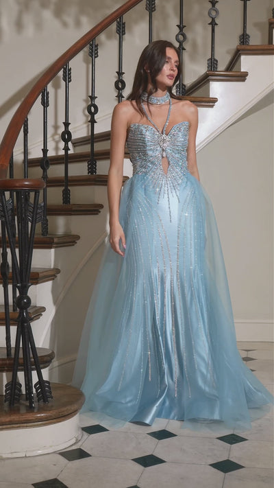 Designed to captivate, this fitted gown features a sparkling halter-inspired neckline and radiant crystal beadwork that catches the light from every angle. The intricate linear embellishments sculpt the bodice and flow down the silhouette, creating a show-stopping, high-glamour effect. A dramatic jewel centerpiece highlights the front cutout, while the sleek satin skirt enhances every curve. Complete with a detachable tulle overskirt, this gown offers two unforgettable looks in one—perfect for pageants, prom, or any luxury affair.