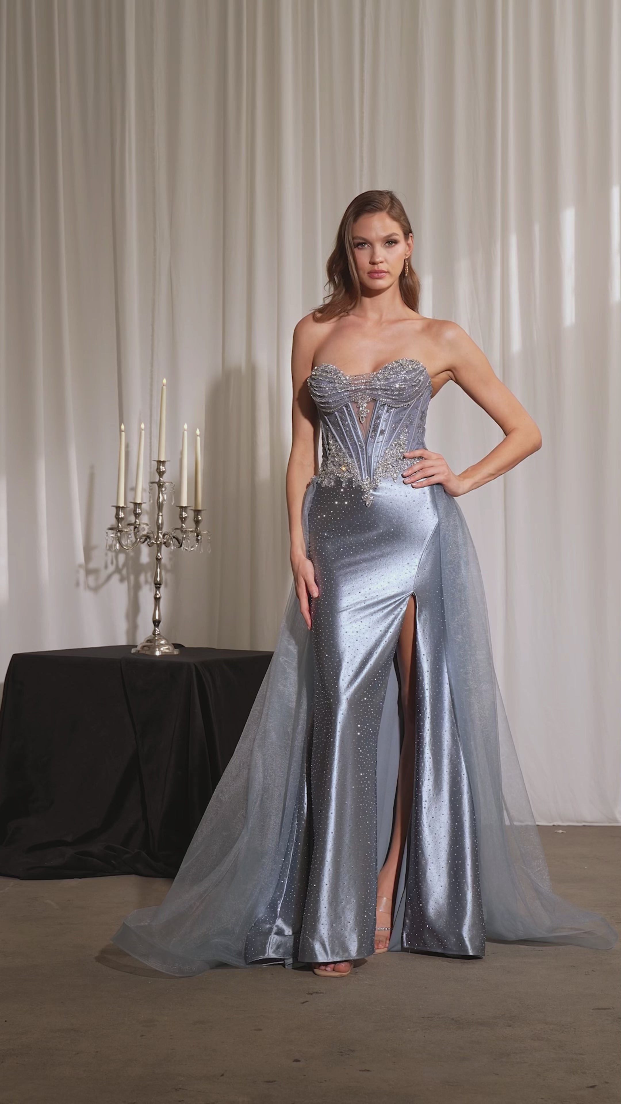 Designed to mesmerize, this gown delivers two unforgettable looks in one. The strapless corset bodice is adorned with sparkling beadwork and crystal appliqué, creating a sculpted silhouette that glows under every light. A sleek satin skirt with a thigh-high slit adds confidence and movement, while the detachable tulle overskirt transforms the gown from runway-sleek to dramatic and red-carpet ready — making it the perfect statement piece for prom night.