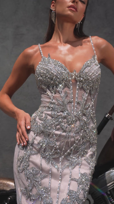 Step into glamour with this fitted evening gown, designed with delicate spaghetti straps and a sweetheart neckline that highlights the beaded bodice adorned with crystals and sequins. The intricate embellishments cascade down the figure-hugging silhouette, creating a shimmering effect with every movement. Finished with a sheer train and open back, this gown is a showstopping choice for prom, black-tie galas, pageants, and formal events.