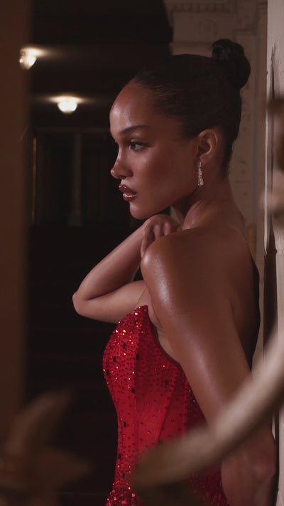 Crafted to captivate, this fitted gown commands attention with its sleek straight neckline and fully embellished sequin design that gleams from every angle. The structured corset bodice sculpts the waist and creates an unforgettable hourglass silhouette, while the shimmering silhouette glides into a dramatic floor-length hem. Timeless, powerful, and breathtaking—this gown brings show-stopping glamour to prom, gala evenings, and unforgettable celebrations.