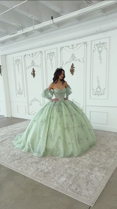 Dazzle on your Quinceanera in our stunning strapless ball gown, designed to make you feel like a princess. The layered tulle full skirt, featuring intricate floral lace appliques and a delicate floral tulle underlay, adds a touch of ethereal beauty to every twirl. The lace applique sheer bodice, with its sweetheart neckline, exudes timeless elegance and grace, while the removable three-quarter-length puff sleeves offer versatility and charm. Available in enchanting blush and sage shades, you can choose the perfect hue to match your style and personality. With a lace-up corset back closure, this gown ensures a flattering fit that will accentuate your figure and leave you feeling radiant all night long. Celebrate in style and create memories to cherish forever in this enchanting ensemble. ...less
