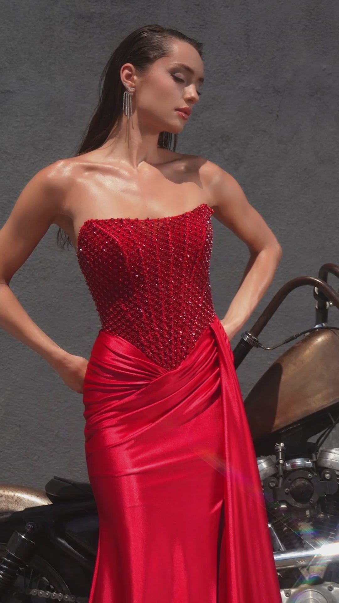 Crafted to command attention, this fitted gown features a strapless neckline and an opulently embellished bodice adorned with dazzling stones. The ruched satin draping across the hips adds luxe dimension, while the high leg slit brings a sultry edge to the overall silhouette. Finished with a sweeping train and ruched back detail, this gown is perfect for prom, gala, or high-glam formal event.