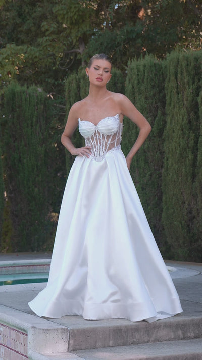 Timeless and romantic, this A-line bridal gown blends fairytale softness with couture detail. The strapless sweetheart bodice showcases pleated cups, exposed corset boning, and delicate beaded appliqué over sheer illusion mesh for a refined yet modern finish. A sweeping Mikado skirt with hidden pockets adds structure and movement, creating a regal silhouette made for walking down the aisle.