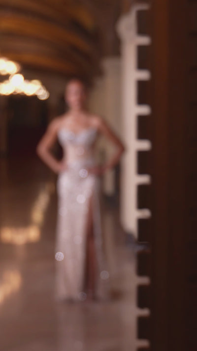 Design: Strapless sweetheart neckline with fully beaded detailing and high slit
