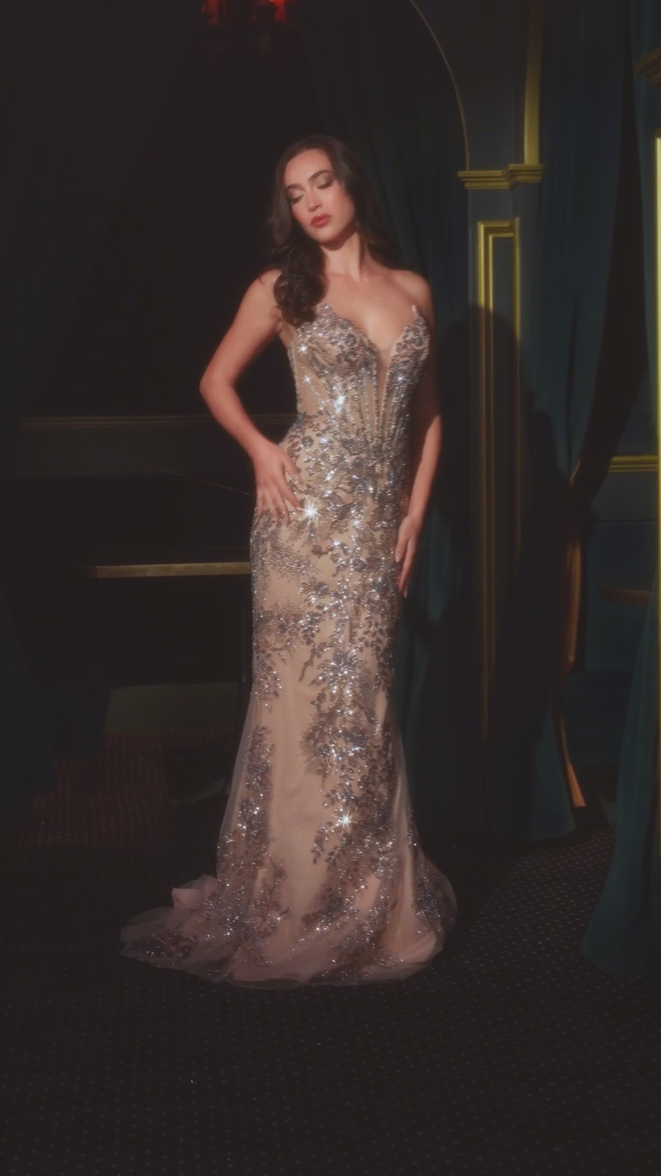 Designed to dazzle, this fitted gown features a plunging neckline and intricate beaded floral detailing that shimmers with every step. The sequin-embellished motif cascades over a soft tulle overlay, creating a mesmerizing effect. With a structured bodice and lace-up corset back, this gown offers both support and style—perfect for prom, pageants, or any glamorous affair.
