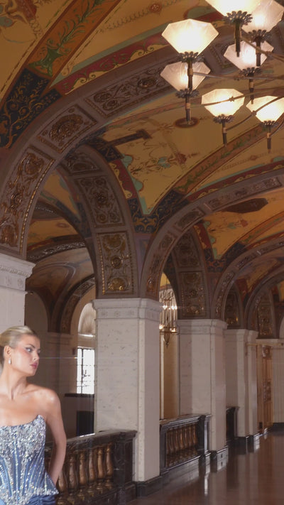 Designed to dazzle, this fitted gown features a fully embellished corset bodice adorned with crystal beading and structured boning for a sculpted silhouette. The strapless neckline dips into a flattering shape, while the shimmering stretch satin skirt glides effortlessly with a high leg slit and gentle train. A lace-up back adds drama and adjustable comfort, making this gown a stunning choice for red carpet events, pageants, or formal galas.