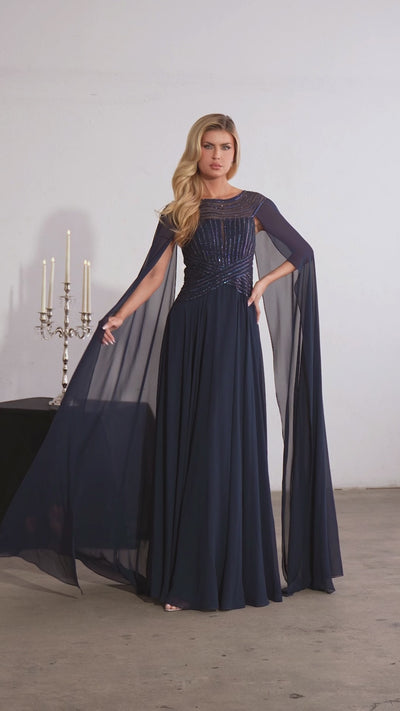 Command the room in this A-line evening gown, designed with a bateau neckline and a beaded bodice that shimmers with intricate crystal detailing. Flowing cape sleeves cascade from the shoulders, adding drama and movement with every step. The soft, floor-length skirt completes the look, making this gown a stunning choice for black-tie occasions and a mother of the bride.