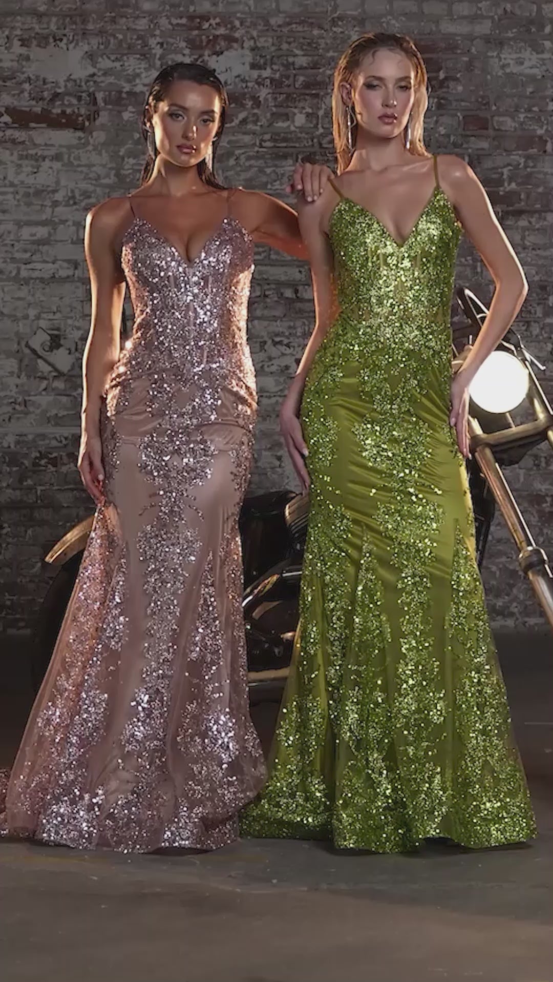 Drenched in glittering elegance, this fitted mermaid gown captivates with its plunging neckline and ultra-flattering silhouette. Intricately embroidered sequin appliqué dances across the bodice and cascades down the skirt, creating a luminous texture that catches the light with every step. Finished with thin straps and a sweep train, this dress is made for show-stopping entrances at any upscale occasion.