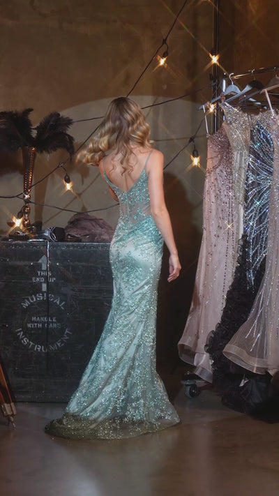 Command attention in this striking fitted gown, featuring a sheer corset bodice adorned with intricate beading and hand-placed appliqué. The delicate spaghetti straps frame a sweetheart neckline, while shimmering sequins trace across the tulle overlay, highlighting every curve. Finished with a subtle train for added drama, this gown delivers the perfect balance of allure and sophistication—ideal for prom, galas, or any formal affair.